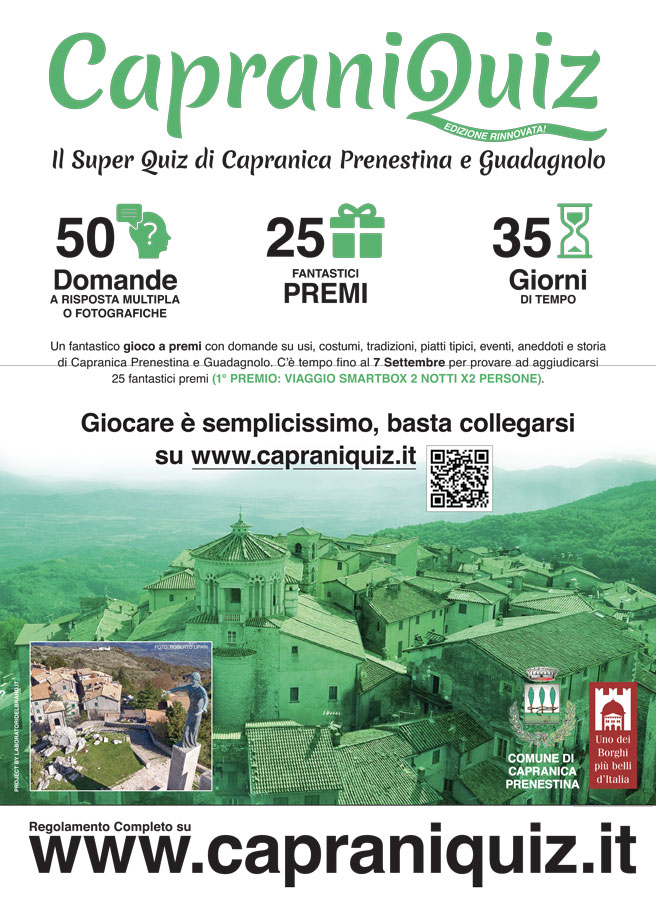 Anche quest’estate grande fermento intorno al CapraniQuiz, il gioco virtuale a premi con domande a risposta multipla sul territorio, le tradizioni, la storia, le bellezze e le curiosità su Capranica Prenestina e Guadagnolo.
