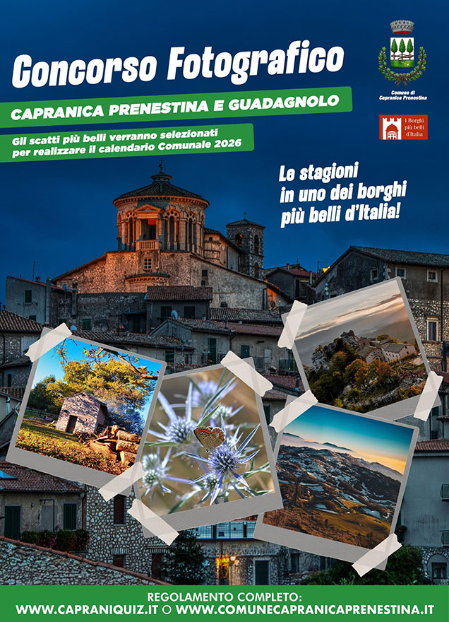 Dopo il grande successo delle precedenti edizioni il Comune di Capranica Prenestina ha dato il via alla 5ª Edizione del Concorso Fotografico offrendo la possibilità a fotografi e amanti della fotografia di raccontare, con il proprio sguardo, uno dei Borghi più Belli d’Italia.