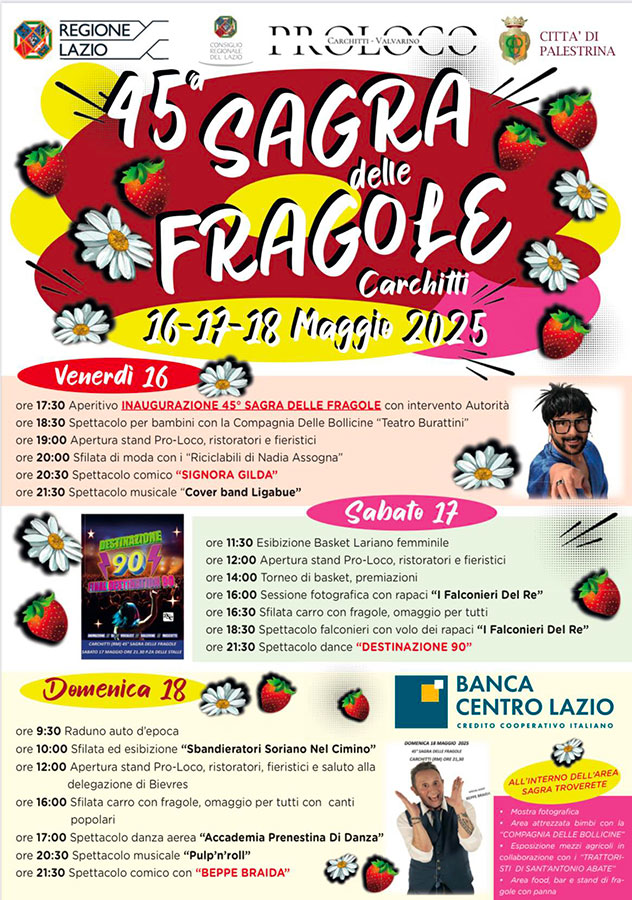 Dal 16 al 18 maggio Carchitti, frazione di Palestrina, si tingerà di rosso per celebrare il frutto simbolo della sua terra: le fragole. Rosse, succose e genuine, saranno le grandi protagoniste della festa, pronte a deliziare i visitatori con degustazioni, dolci tipici e specialità locali preparate con passione e maestria.
