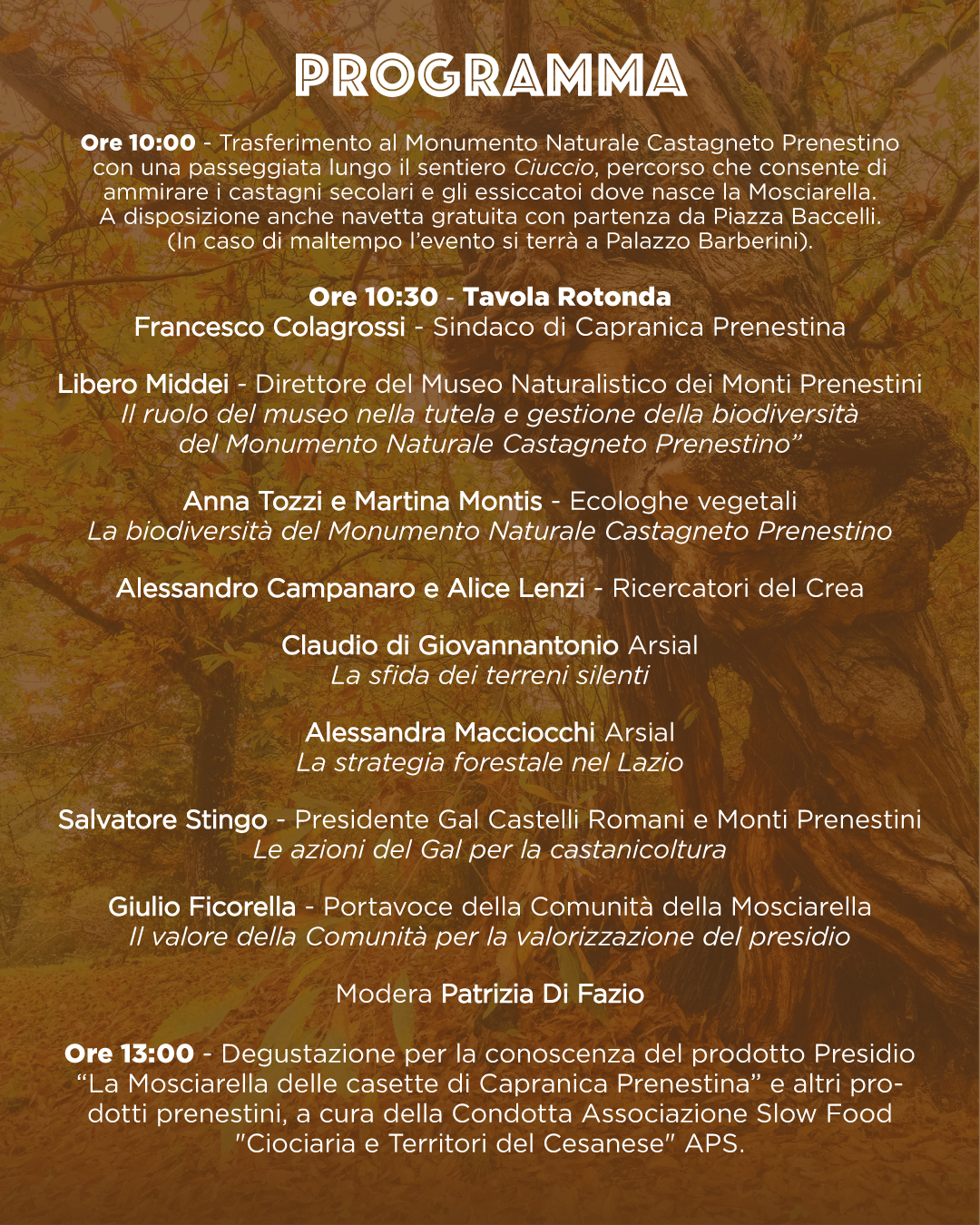 La giornata inizierà alle ore 10:00 con il trasferimento degli ospiti verso il Castagneto Prenestino, tramite una breve passeggiata lungo il suggestivo sentiero Ciuccio, un percorso immerso nei colori autunnali che conduce direttamente ai castagni secolari e agli antichi essiccatoi, custodi della tradizione che dà vita alla celebre Mosciarella. Per chi preferisce, sarà disponibile anche una navetta gratuita in partenza da Piazza Baccelli. In caso di maltempo, l’evento verrà spostato all’interno di Palazzo Barberini.
