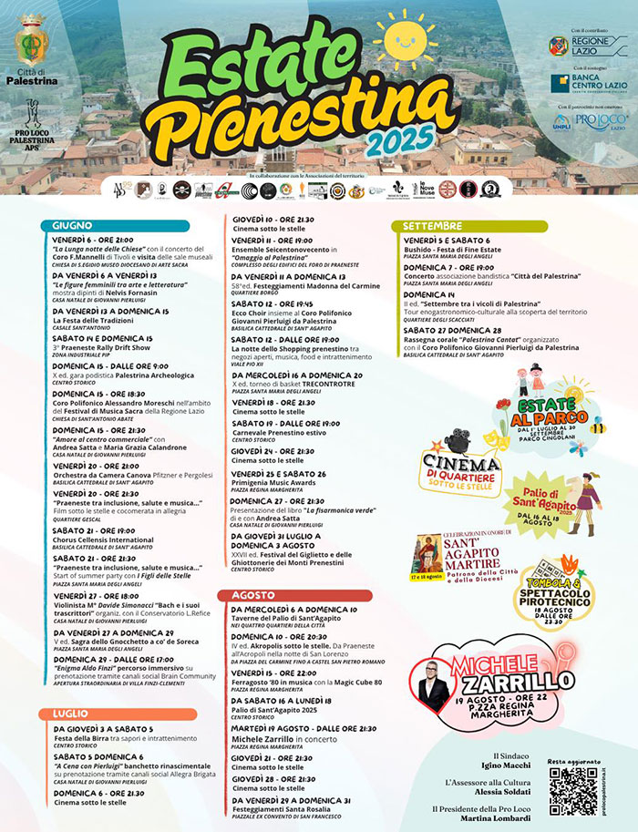 Organizzata dal Comune di Palestrina, in collaborazione con la Pro Loco Palestrina APS e con il prezioso contributo di numerose associazioni del territorio, la rassegna si snoderà da giugno a settembre e toccherà tutte le anime della città: culturale, popolare, religiosa e naturalmente artistica.
