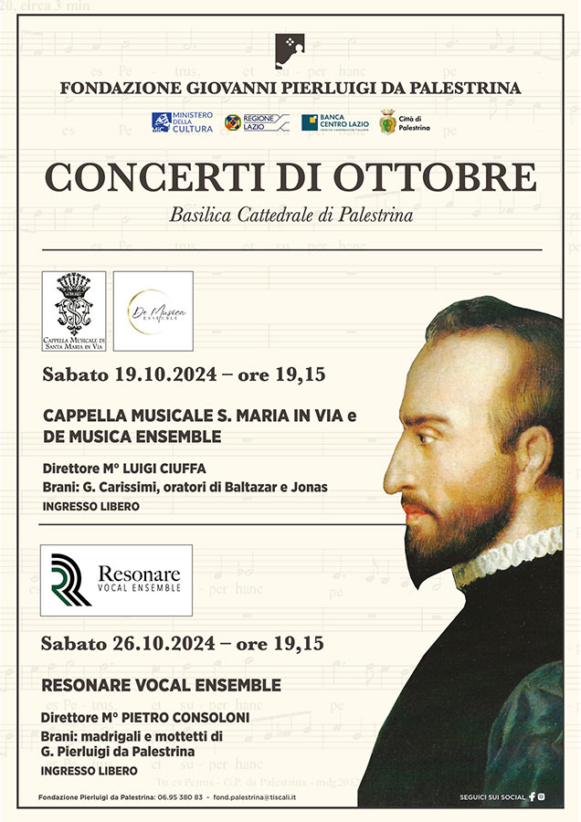 Il secondo appuntamento è fissato per sabato 26 ottobre, sempre alle ore 19:15, con l’esibizione del Resonare Vocal Ensemble, diretto dal Maestro Pietro Consoloni. La serata sarà dedicata ai madrigali e mottetti del grande compositore Giovanni Pierluigi da Palestrina.