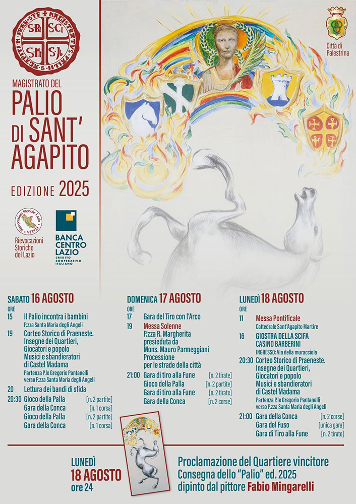 Anche quest’anno Palestrina attende il sentitissimo Palio di Sant’Agapito, giunto alla sua 45ª edizione. Il palio rappresenta la storia e il folklore della città attraverso la tradizionale sfida tra i 4 quartieri in gara.