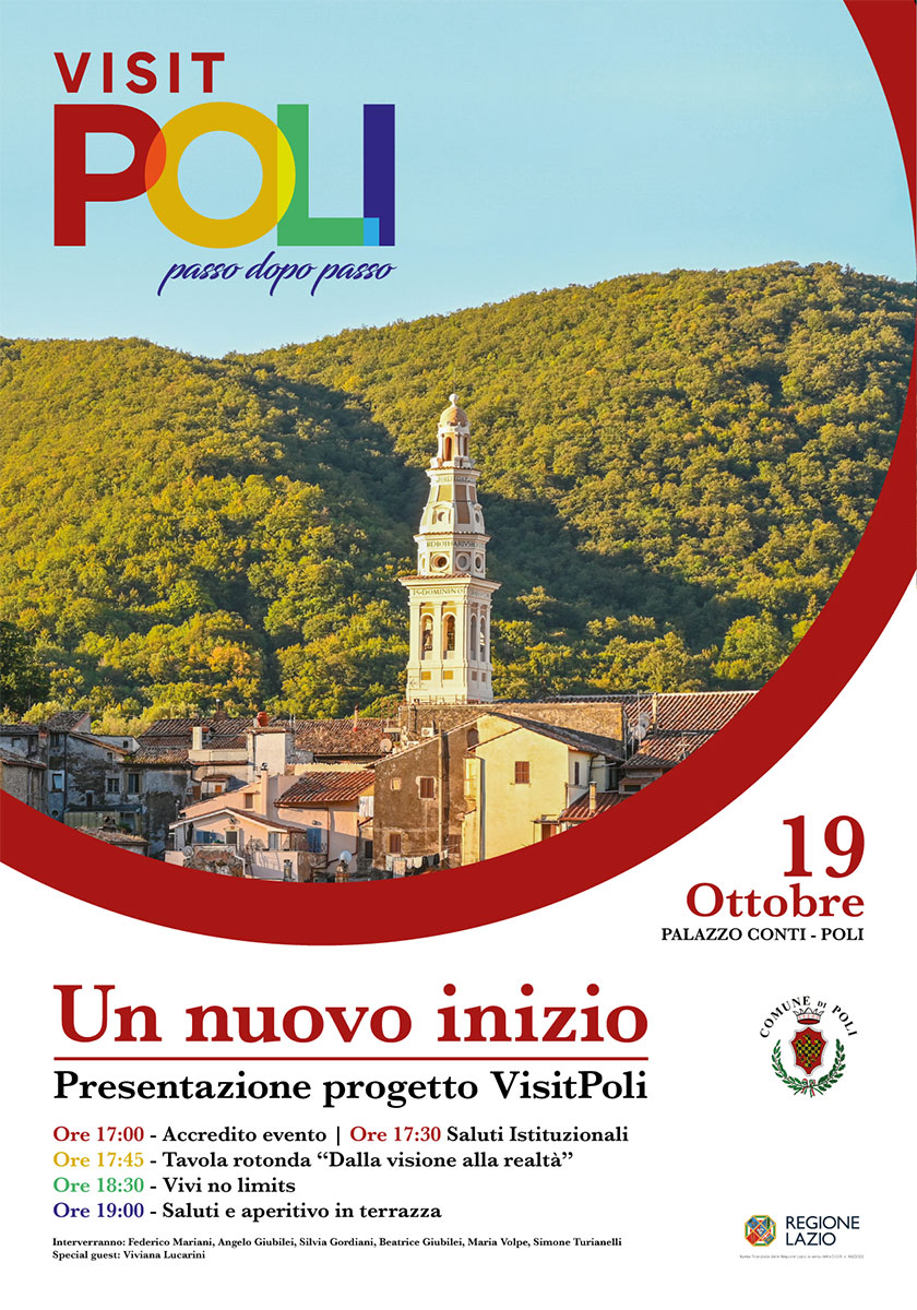 Alle ore 17:00 si apriranno le porte di Palazzo Conti per l’accredito all’evento e la consegna della shopper contenente la nuova mappa di Poli nonchè alcuni gadget omaggio in regalo per tutti i presenti. I saluti istituzionali del Sindaco Federico Mariani, previsti alle ore 17:30, apriranno la tavola rotonda “Dalla visione alla realtà” alla quale interverranno Angelo Giubilei, Silvia Gordiani, Beatrice Giubilei, Maria Volpe e Simone Turianelli.