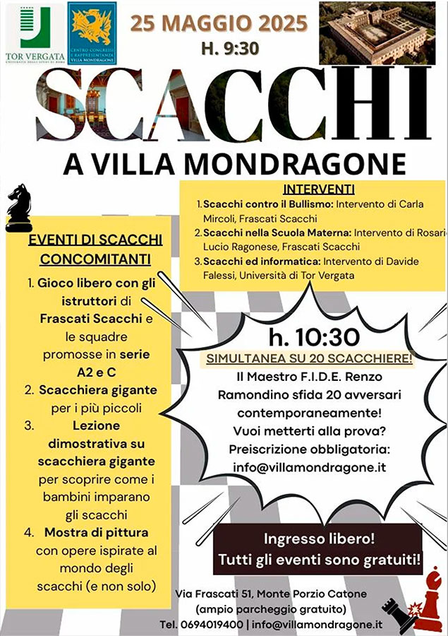 Domenica 25 maggio, a partire dalle ore 9:30, Villa Mondragone ospiterà una giornata speciale all’insegna degli scacchi e del loro straordinario valore educativo e sociale. L’iniziativa, in collaborazione con Frascati Scacchi e il Centro Congressi Villa Mondragone, sarà completamente gratuita e aperta al pubblico.